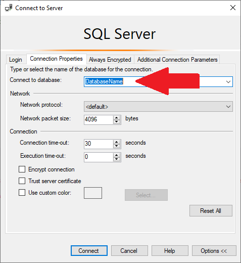 SQL Server Management Studio (SSMS) Database Name Must by Specified on Connection Properties tab